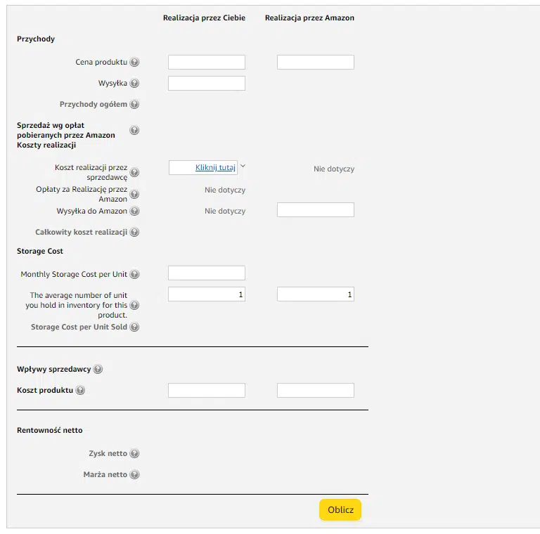 4. Następnie uzupełnij analogiczne dane w sekcji „Realizacja przez Amazon” – dodaj koszt wysyłki do magazynu Amazon, liczbę sztuk, cenę sprzedaży i koszt zakupu towaru.