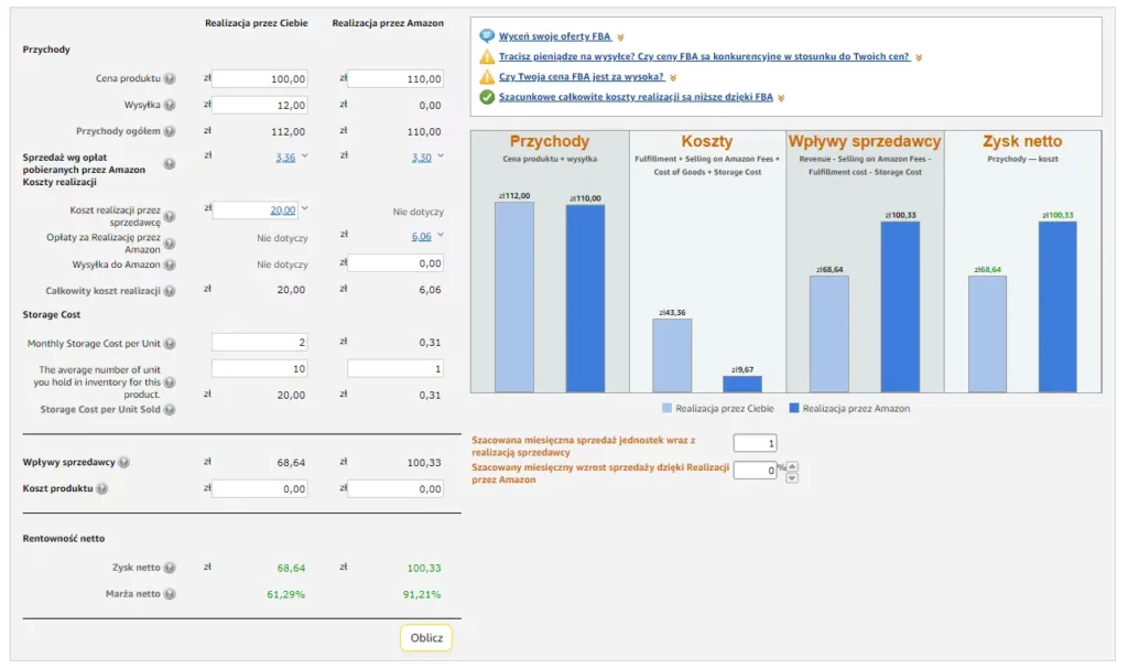 Amazon umożliwia swoim sprzedawcom skorzystanie z kalkulatora przychodów FBA, który pozwala porównać opłacalność sprzedaży w dwóch modelach – FBA i FBM.